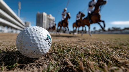 A detailed close-up of a golf ball resting on lush green grass, with polo players in dynamic motion in the background showcasing the thrill of equestrian sports.