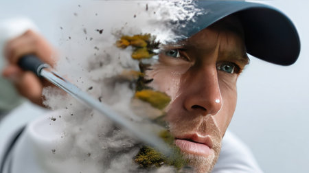A striking image of a golfer captured in intense focus, blending elements of nature and sport through creative visual effects that convey emotion and energy.
