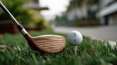 A close-up view captures a golf club poised next to a white golf ball resting on a tee, set against a vibrant green grass backdrop, perfect for illustrating golfing passion.
