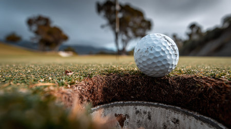 A close-up view of a golf ball resting near the hole on a well-maintained green, highlighting the lush grass and depth perspective, ideal for sports enthusiasts.