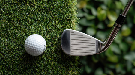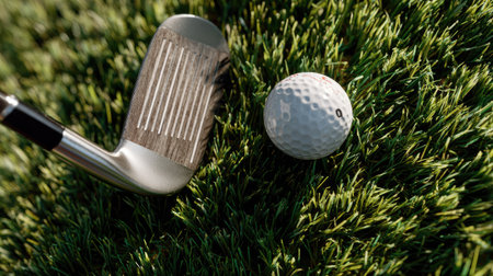 This close-up image captures a golf ball and an iron club resting on lush green turf, emphasizing the elegance and precision of the sport. Perfect for golf-related content.
