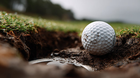 A close-up view of a golf ball resting in a muddy bunker with water pooling beneath, set against a backdrop of cloudy skies and lush grass.