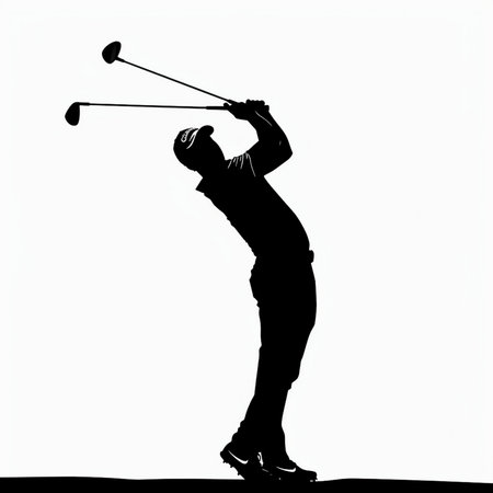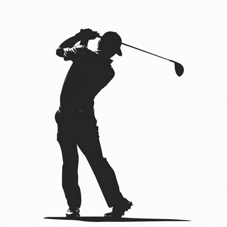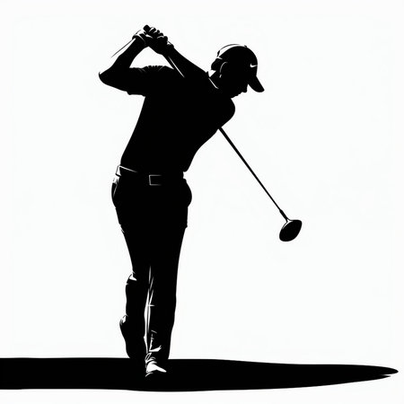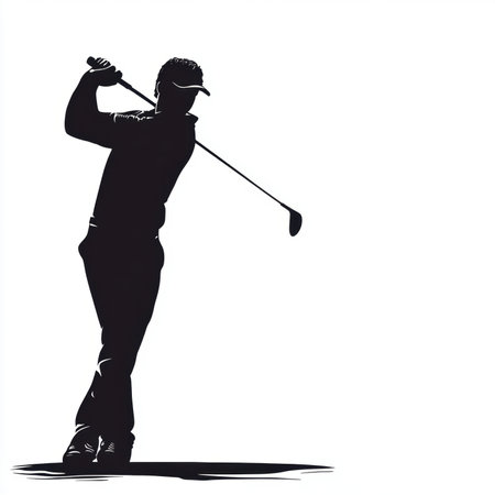 A dynamic black silhouette of a male golfer in mid-swing, captured from a low angle, showcasing the sport's athleticism.