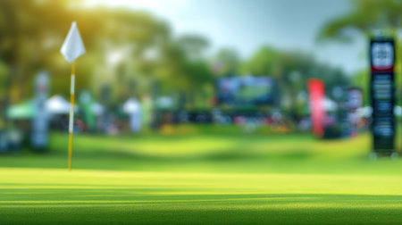 A captivating blurry view of a golf course featuring a prominently placed flag, emphasizing the vibrant atmosphere of an outdoor sporting event on a sunny day.