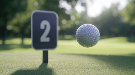Flying golf ball with morning dew on grass below, hole number resting nearby on path