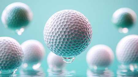 Golf balls levitate over clear water, creating a tranquil and mesmerizing atmosphere.