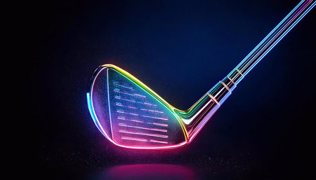A focused male golfer is captured mid-swing against a backdrop of vibrant neon lights at night. The image conveys energy, dedication, and the excitement of the sport.