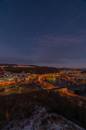 View from Vetruse building over Usti nad Labem city in winter color sunny evening after sunset