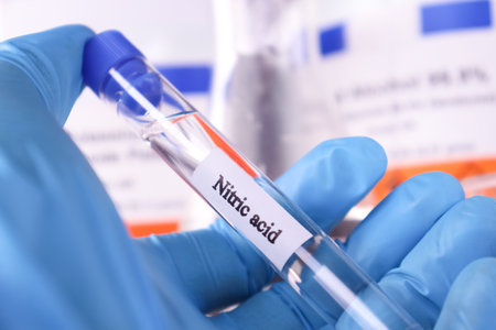 Close-up. Lab technicians hands in medical gloves, holding a litmus or reagent paper, conducting PH test, measuring the acidity or alkalinity of substances in a Petri dish in medical study laboratory