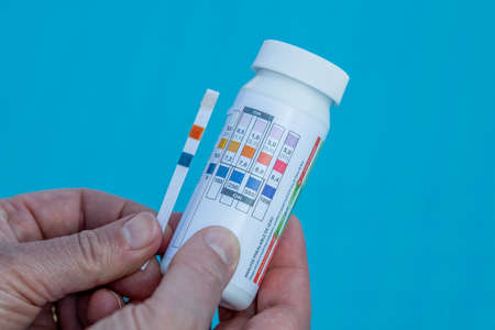 checking chlorine pollution in blue water of outdoor pool by chemical tester