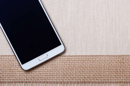 High quality, technology, gadget for modern people. White modern smartphone with blank screen lies on textile.