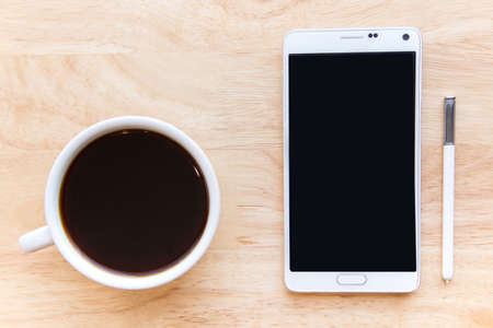 Mobile phone with blank screen and hot black coffee.