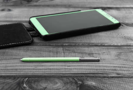 On the wooden table is a smartphone and pen green color with white display, there are a place in your text or picture