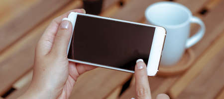 Cropped shot of female freelancer using mock-up smartphone while sitting at coffee table beside window in living room