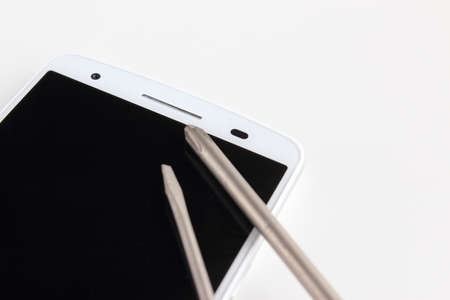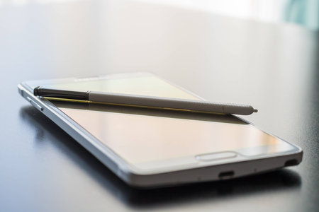 Stylus pen on a smart phone. Dark background. Technology mobile.