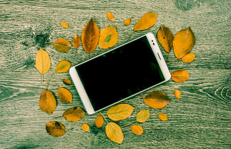 black mobile phone on a wooden old autumn background, near the yellow autumn leaf.Copy space