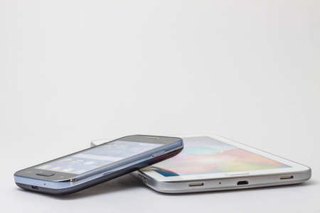 Phones and tablet on a light background close up. Side view
