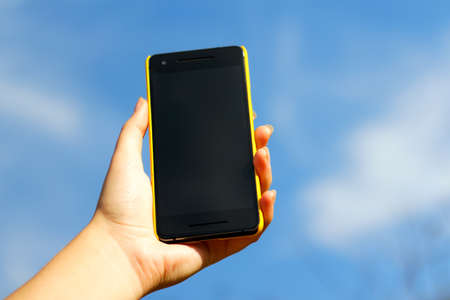 Woman hand holding black smartphone in yellow plastic case on blue sky nature background, sunny day. blackscreen. Mockup, mock-up, mock-up. female hand. smart phone.