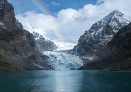 Mountain landscape with glacier and rainbow, Cordillera Blanca, Peru