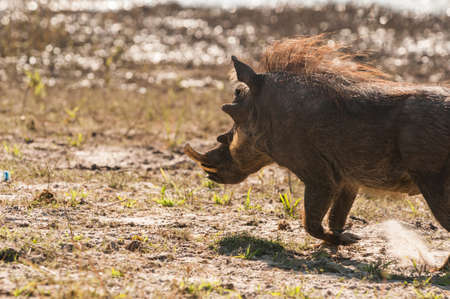 Running warthog (Phacochoerus africanus) up close in Botswana