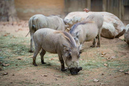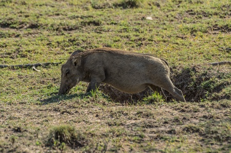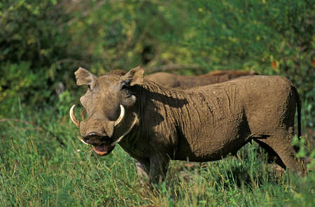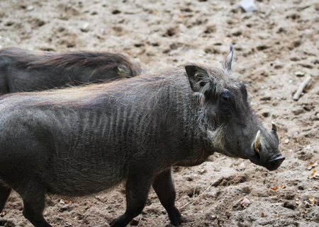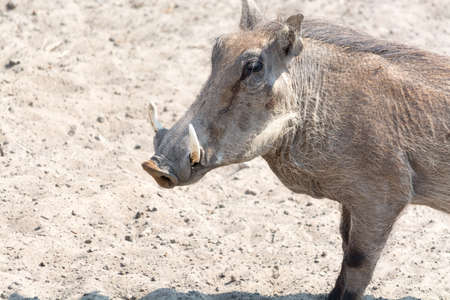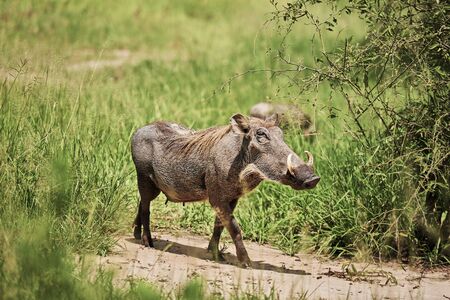 A common warthog (Phacochoerus africanus) this species of mammal lives in the African savannah, in the wild and in the African wildlife, these animals are very attractive for safaris.