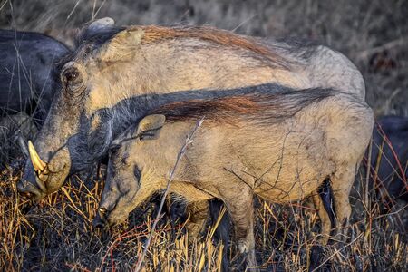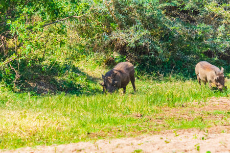 Pair of Warthogs known as Pumbaa from the Lion King movie walking freely in the Pilanesberg National Park in South Africa, an ideal place to go on safari and enjoy the African savannah.