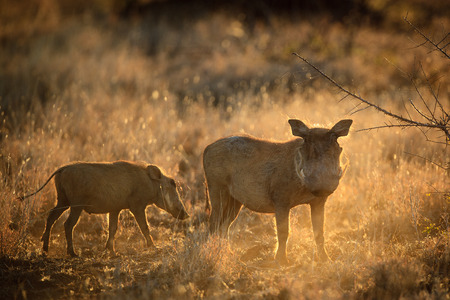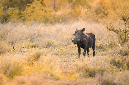 A common warthog (Phacochoerus africanus), standing alone in a grassy opening in the bush, the shrubbery lit up in golden evening light. Kruger National Park, South Africa