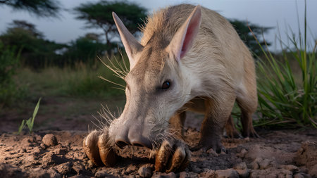 a nocturnal aardvark digs in the dirt for food in its natural african habitat at twilight hour.