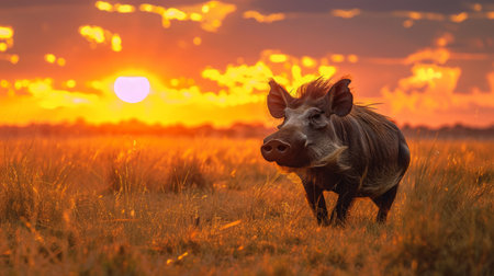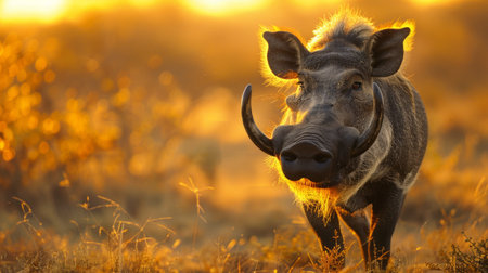 A warthog standing in the wild during the golden hour, highlighting the beauty of wildlife and natural lighting