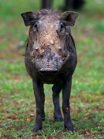 Close-up view of common warthog Phacochoerus africanus standing on grass, Kruger National Park, South Africa