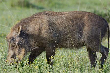 Warthog eating in the African savannah grasslands of the Pilanesberg National Park in South Africa, this animal, also known as pumbaa, is one of the stars of African safaris.