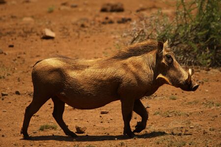 side view of walking common warthog against savannah background, Kruger Park, South Africa