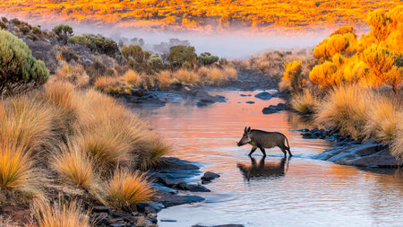 Warthog traverses a shallow, reflective river at dawn surrounded by intensely golden grasses and low-lying mist obscuring the distant mountainous terrain creating a dramatic.