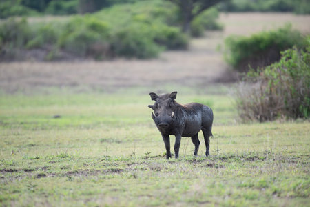 Wild African pig or warthog with large fangs feeds in the savannah. Female warthog feeds on grass in the swampy floodplain of the Limpopo River.