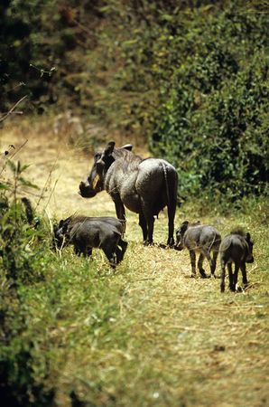 The warthog family on savannah in the Ngorongoro crater, Tanzania, Africa.