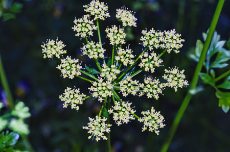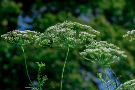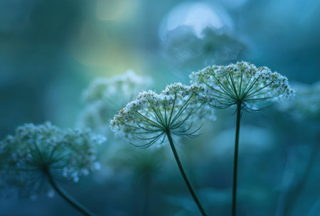 Generative AI : Beautiful white umbellate inflorescences of wild meadow grass in nature macro toned in blue color with soft focus