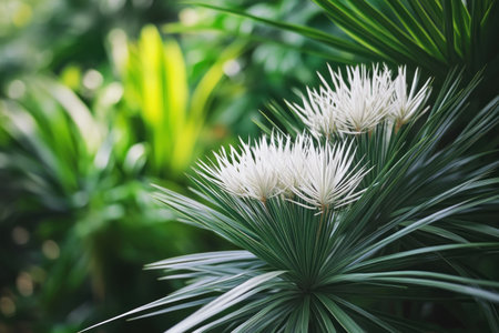 In local park grows plants with long green leaves. Exotic plants brought from Europe. Concept of modern plants and study of new types of flowers.