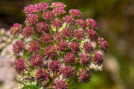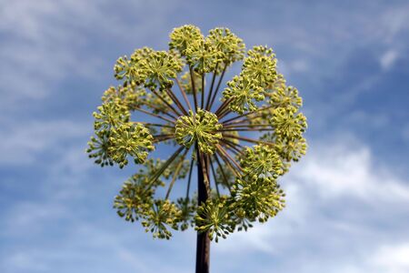 Angelica archangelica, garden angelica, wild celery, or Norwegian angelica plant with globular umbel inflorescences of