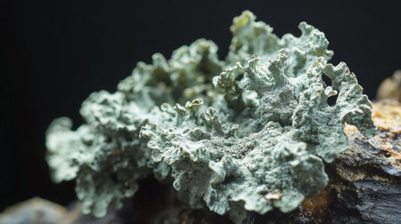 A detailed macro shot showcases a delicate bluegreen lichen with intricate, corallike structures growing on weathered wood.