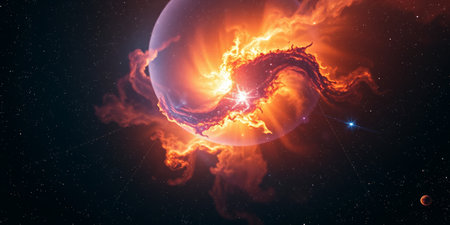 Witness the stunning beauty of a comet streaking through space, with fiery hues and intricate trails set against a starry backdrop. Natures cosmic ballet unfolds.