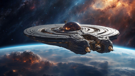 Alien spaceship in space. Alien spaceship in deep space. Science fiction.