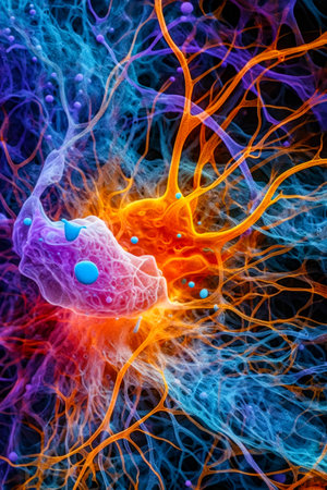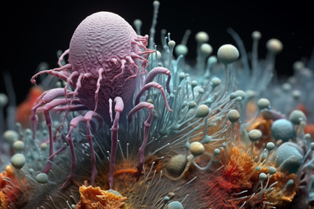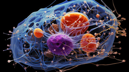 A close-up of a colorful cellular structure featuring fine filaments and textures. This detailed representation highlights the complexity of microscopic life forms in a scientific setting.