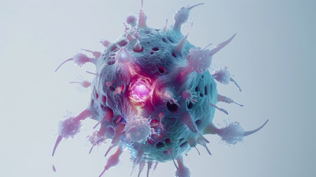 The cancer cell's aggressive and invasive nature is emphasized through its detailed, ominous appearance.