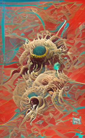 A detailed illustration showcases a colorful cell with filaments and textures, highlighting its complex structures and biological features in a laboratory environment.