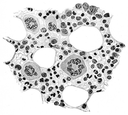 Section of bone marrow of rabbit showing the delicate connective tissue reticulum containing the different element of the marrow, vintage engraved illustration.