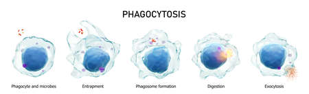 Phagocytosis . Step by step process of macrophage is swallowing and killing microbes . Isolated white background . Medical immunity concept . 3D rendering .