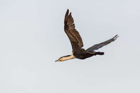 Great Cormorant (Phalacrocorax carbo) in flight against blue sky