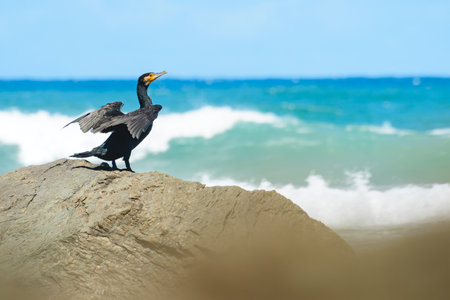 Great cormorant (Phalacrocorax carbo) a large water bird with dark plumage, the animal sits on a rock with spread wings and dries them in the sun, on the seashore.