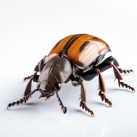 a close-up of a bold and graceful brown, black, and orange beetle, captured against a white background with high-key lighting. the image showcases the unique characteristics of this beetle, reminiscent of the artistic styles of mars ravelo and yasutomo oka. the use of the sabattier effect adds an intriguing touch to this portrayal of nature's captivating creatures. ai generated