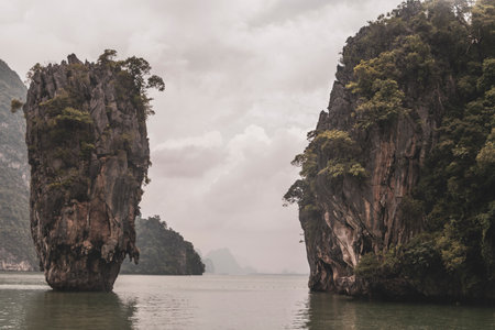 Rocky tropical landscape and mist in the Pang Nga bay, Thailand